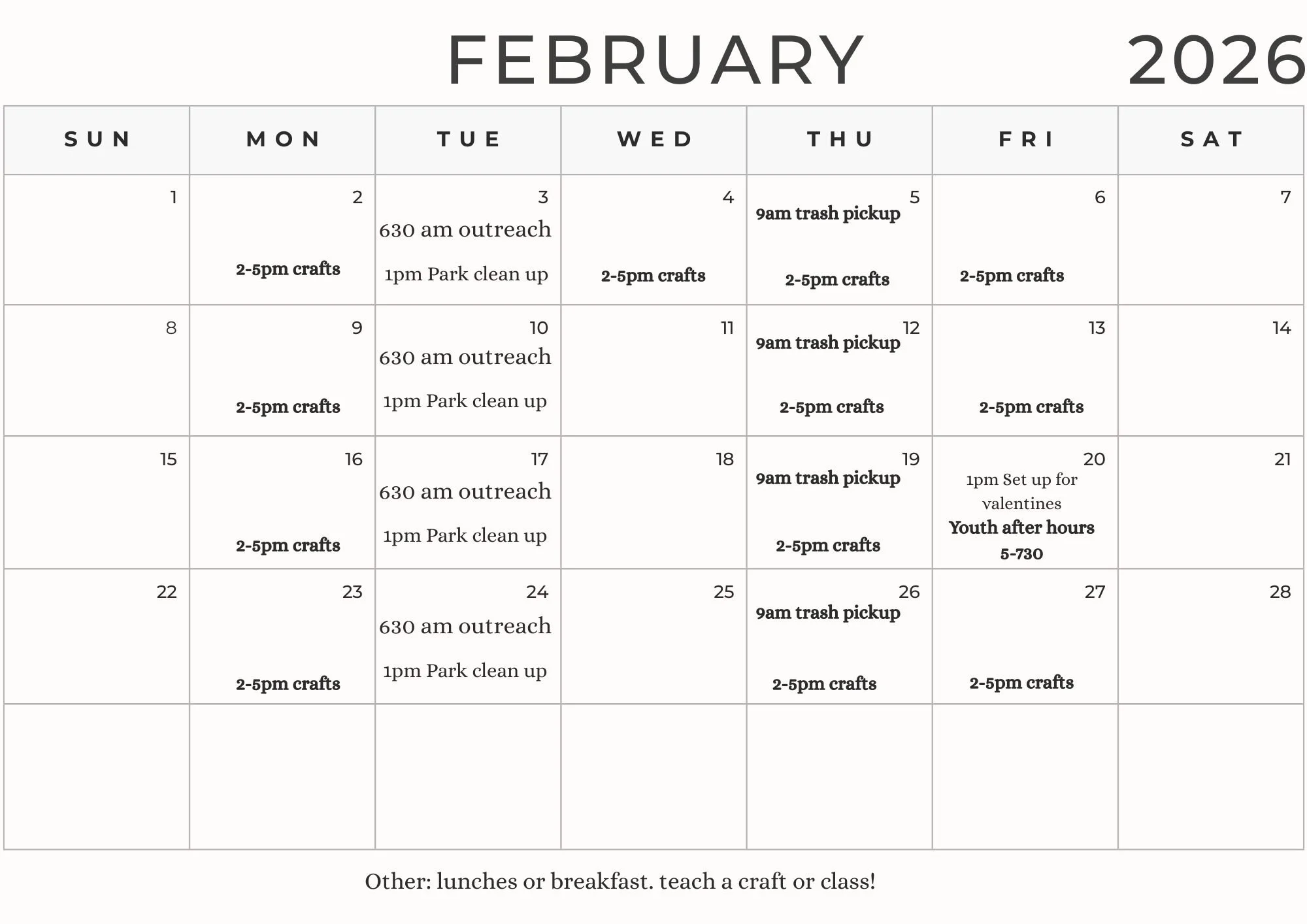February 2026 volunteer calendar. If interested in one of these events, please reach out to our Volunteer coordinator Alex Banks 253-678-3647